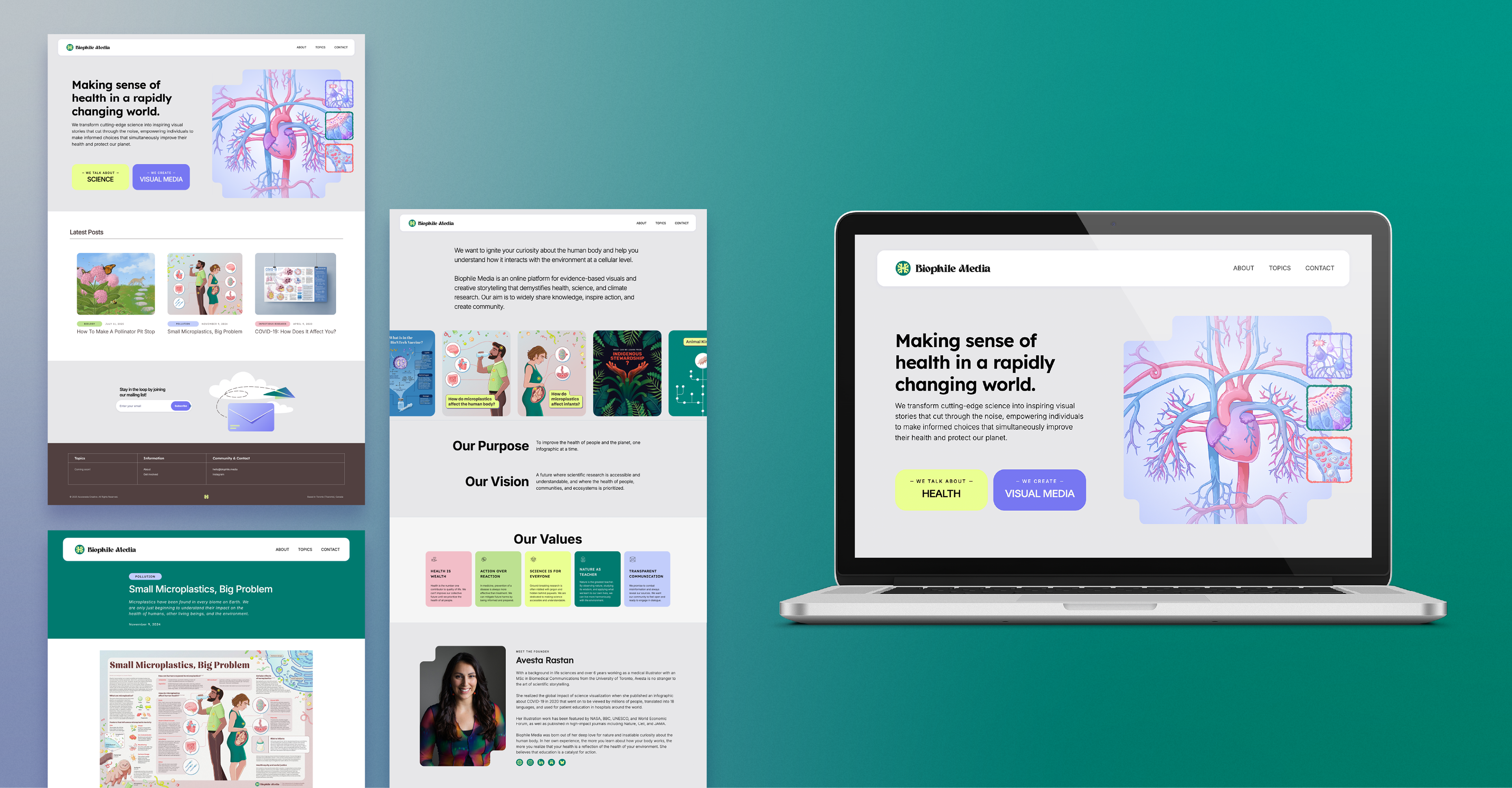 Over the course of a year, I developed the brand identity for Biophile Media and launched the website. Inspired by nature and Solarpunk, I wanted it to feel fresh, bold, and inviting!