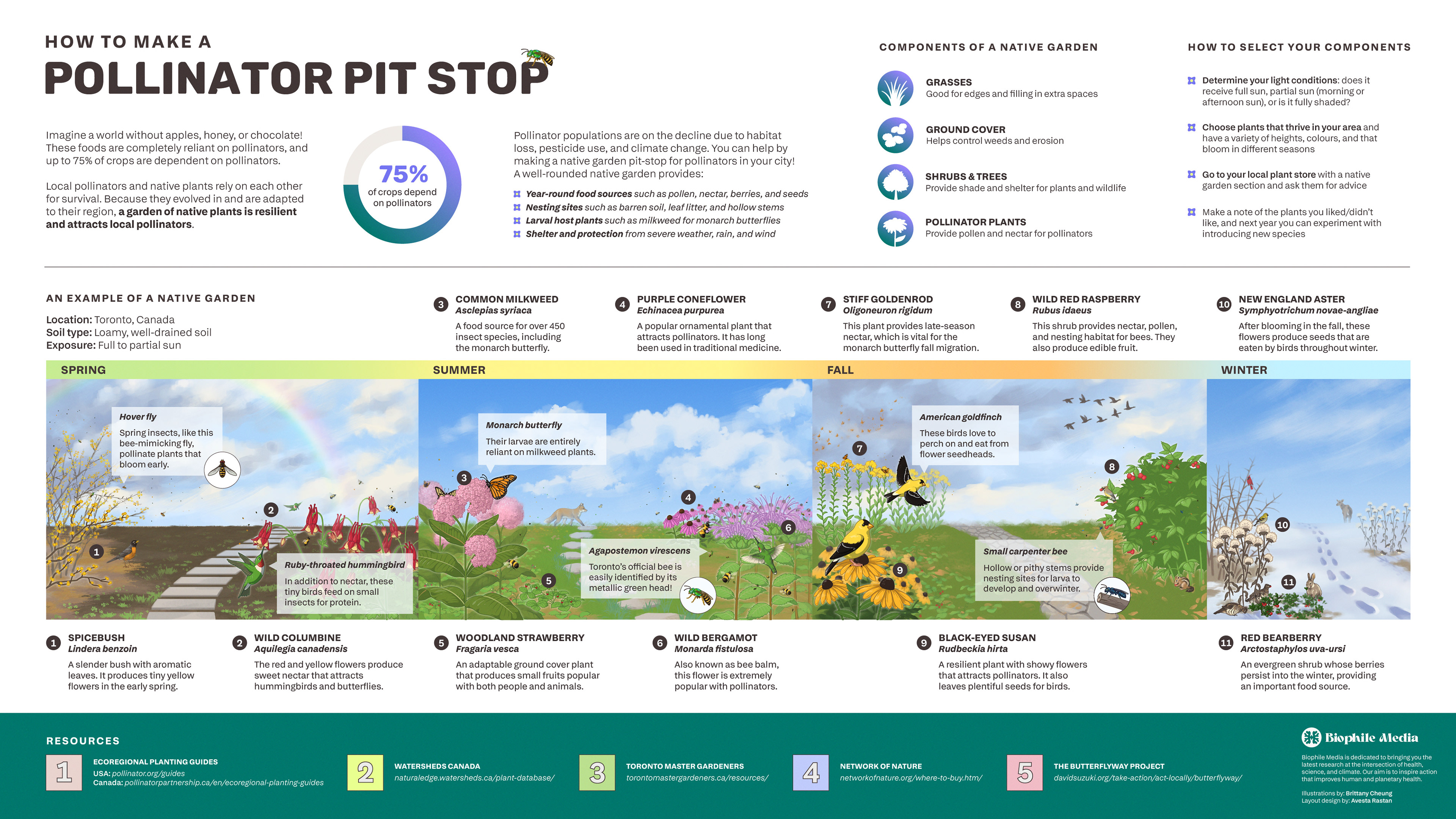 This project was created to raise awareness of a simple solution to increasing biodiversity in urban environments—pollinator gardens! This infographic was created in tandem with Brittany Cheung, who illustrated the main graphic. I assisted with the writing and layout design.